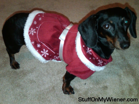 This is Penny, my own doxie, in her Christmas dress. Mommy caught the shot for the Pet’s Christmas card this year.