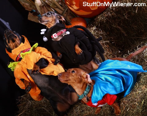 Bailey (pumpkin) , Chloe (spider), and Sadie (Underdog) attend their first Halloweenie party.